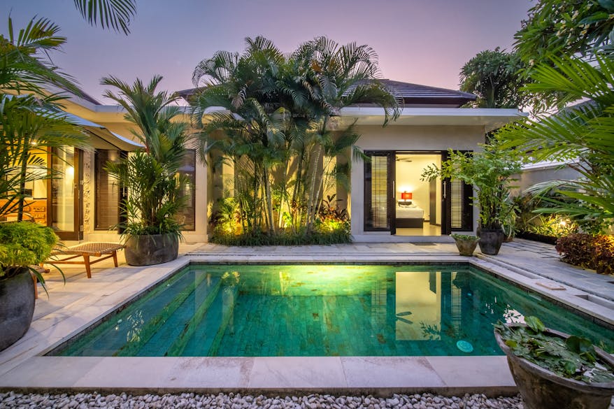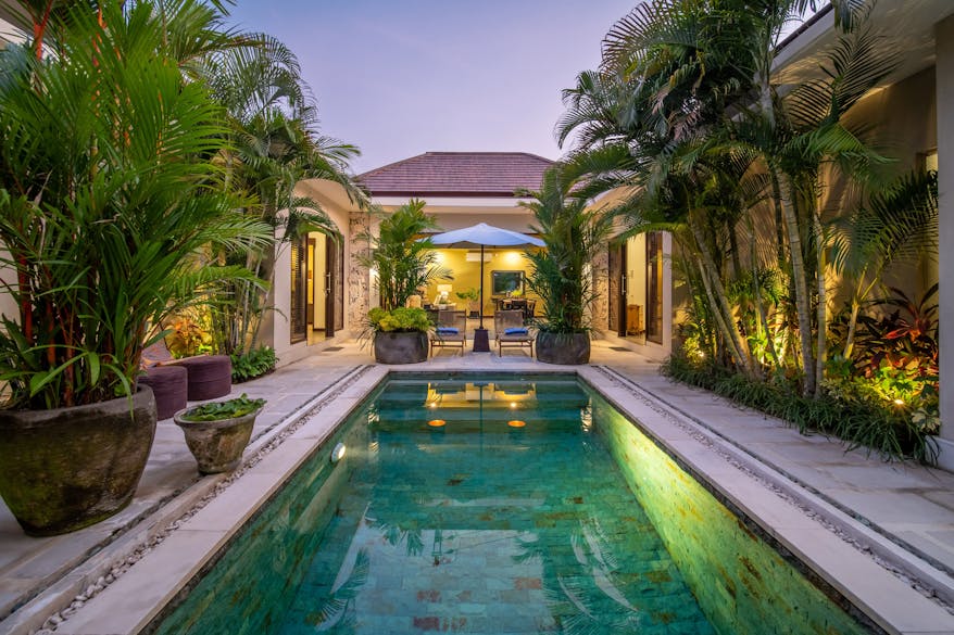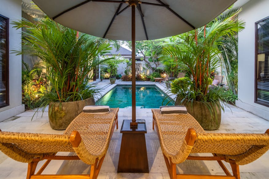 Lush tropical foliage, characteristic of Bali, stays vibrant and green year-round, creating a serene backdrop for relaxation. The villa offers several inviting spots to sit or lounge, with comfortable seating and sunbathing space for up to six guests—pool towels included. The courtyard is perfect for soaking up the sun by day and transforms into a charming setting for evening cocktails or a cold beer or two.
